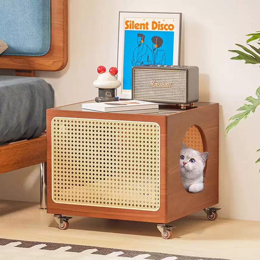 Dual-Level Side Table with Rattan Cat Bed & Amber Glass